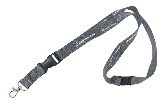 Lanyard, 2 cm wide, with a safety lock at the neck and a pistol lock at the front. Printed in white.